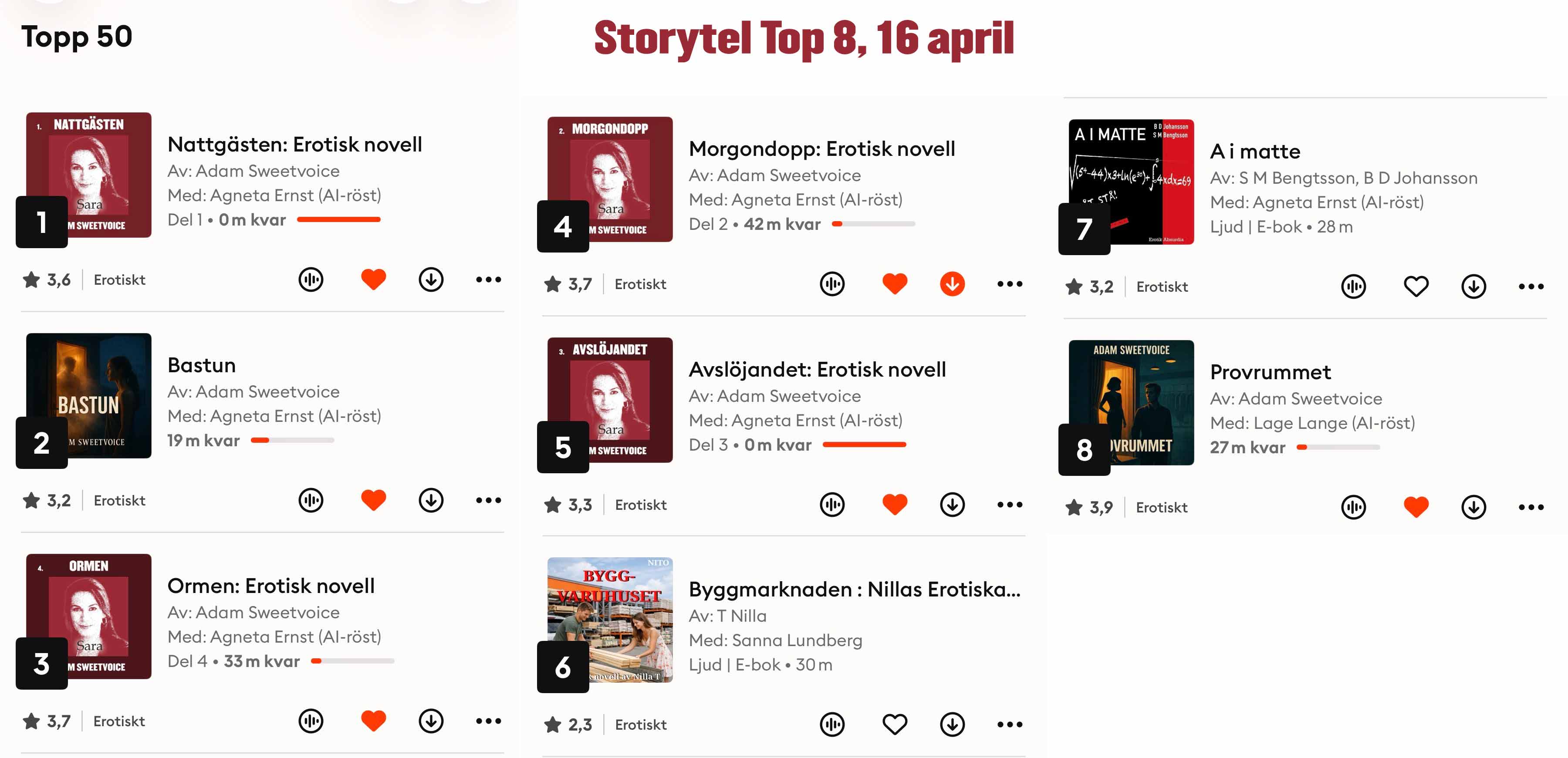 Heta och väldskrivna. Ljudboken perfekt för skön njutning..